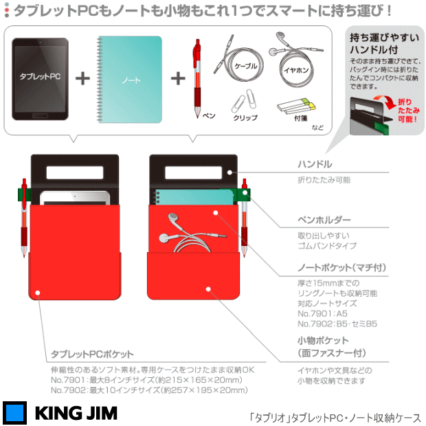 タブレットPC、ノート・手帳、筆記用具、小物などこれ1つでスマートに持ち運び!バッグインバッグ 通勤 社内会議などに大変便利です! 商品名 タブリオ タブレットPC・ノート収納ケース Mサイズ 品番 7902 サイズ 約)228×323×厚さ22mm 仕様 10インチ タブレットPC対応 タブレットPCポケット収納可能サイズ:257×195×10mm、折りたたみ可能なハンドル、ゴムバンドタイプのペンホルダー、ノートポケット、小物ポケット 材質 ポリエステル、合成ゴム メーカー 株式会社 キングジム ※他のモール及び店頭売りと在庫を併用しておりますのでご注文後でも在庫切れの場合がございますのであらかじめご了承下さい。